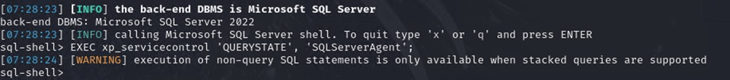 The reason in our case is the nature of the vulnerability, which in that case is a Boolean based SQL-Injection. Additionally, this SQL injection does not support stacked queries, which are needed to call stored procedures like xp_cmdshell or system stored procedures like sp_start_jobs. Stacked queries are those that typically combine multiple queries but treat them as a single query, with arbitrary subqueries separated by semicolon separators. In our experience, finding an SQL injection technique that supports stacked queries is much rarer in real-world applications than any other technique.