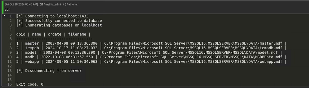 The Athena agent has the capability of executing C# assemblies and BOFs that can make the job of post exploitation easier. In this scenario, we have plenty of options. We can go for SharpSQL via execute-assembly module or we can go for BOFs. For this scenario I decided: Let’s see some BOFs in action!