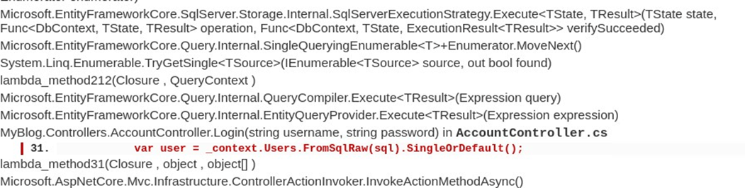 When FromSqlRaw is used in Entity Framework, it allows us to run raw SQL queries against the database, but it expects those queries to conform to EF's model-mapping rules. Methods like SingleOrDefault are designed to retrieve a single entity, so EF expects the SQL query to return a result that maps to a single row in a single table. If a nested query or injection changes the structure of the query to return multiple rows, columns, or unexpected shapes, EF will throw an exception because the result cannot be properly mapped to the entity class.