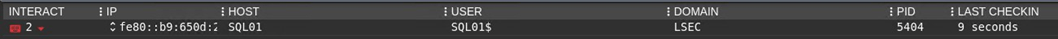 This attack gave us a command & control connection with the context of the machine account itself. From the screenshot above, it is visible that we are operating with high integrity (the INTERACT color is red), but in order to get more details about the connection, you can click the arrow (INTERACT column). Tasking Views -> Expand Callback