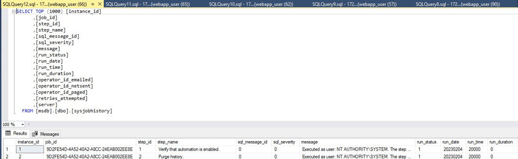 One additional approach would be to query the database for the presence of already established and executed start jobs. This will indicate that the service was at least used. The start jobs are by default saved under the system tables of the MSDB database. There are multiple tables that can reveal interesting information about the jobs.